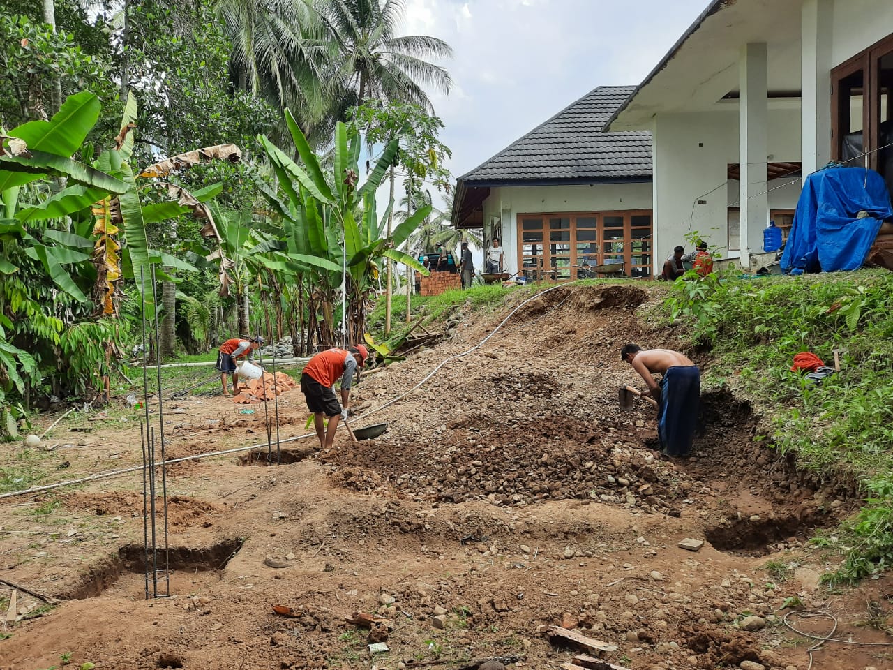 Pengerjaan galian tanah berjalan dengan lancar sehingga waktu yang di tentukan dengan SPK kami lebih cepat, dengan tenaga seadanya mengingat daerah yang tidak memungkinkan mendatangkan alat keruk yang pastinya mahal nanti bayarnya. Walaupun begitu kami tetap bekerja dengan senang hati, Pembuatan Stroos dengan baja dan cakar ayam ikut memperkokoh bangungan kolam renang.